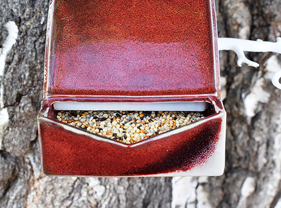 3D printed porcelain, 3D printed plastic, metal hook, bird food.